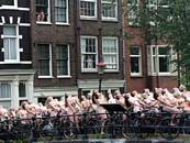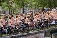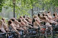 Then dozens of naked woman posed naked on their bicycles on a bridge over one of Amsterdam's historic canals.