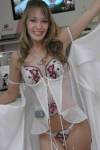 The lingerie combo consists of lace bodice, bikini bottom and faux pearl collar, with the GPS device visibly nestled in the see-through part of the bodice next to the waist.