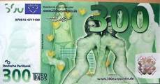 The notes come in 300, 600 and 1,000 euro denominations and have a ring of 12 hearts instead of the usual EU stars. They prominently feature big-breasted nude women and hunky men on a background similar to the real bills.